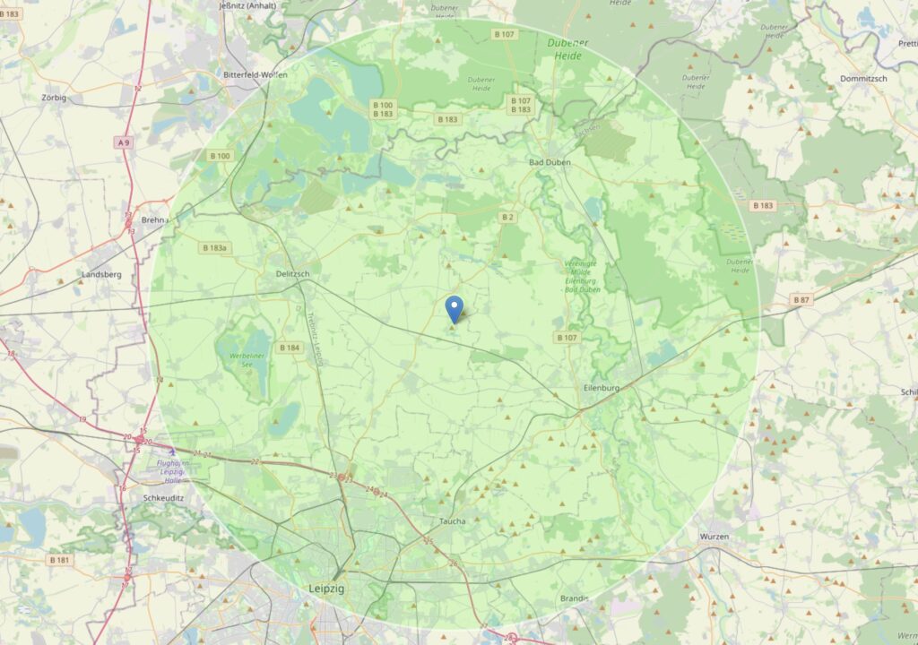 Ich biete Pflasterpass® -Kurse im Umkreis von 20 km um Schönwölkau (roter Punkt auf der Karte) an. Ab 10 km berechne ich Fahrtkosten von 80 cent pro Kilometer.